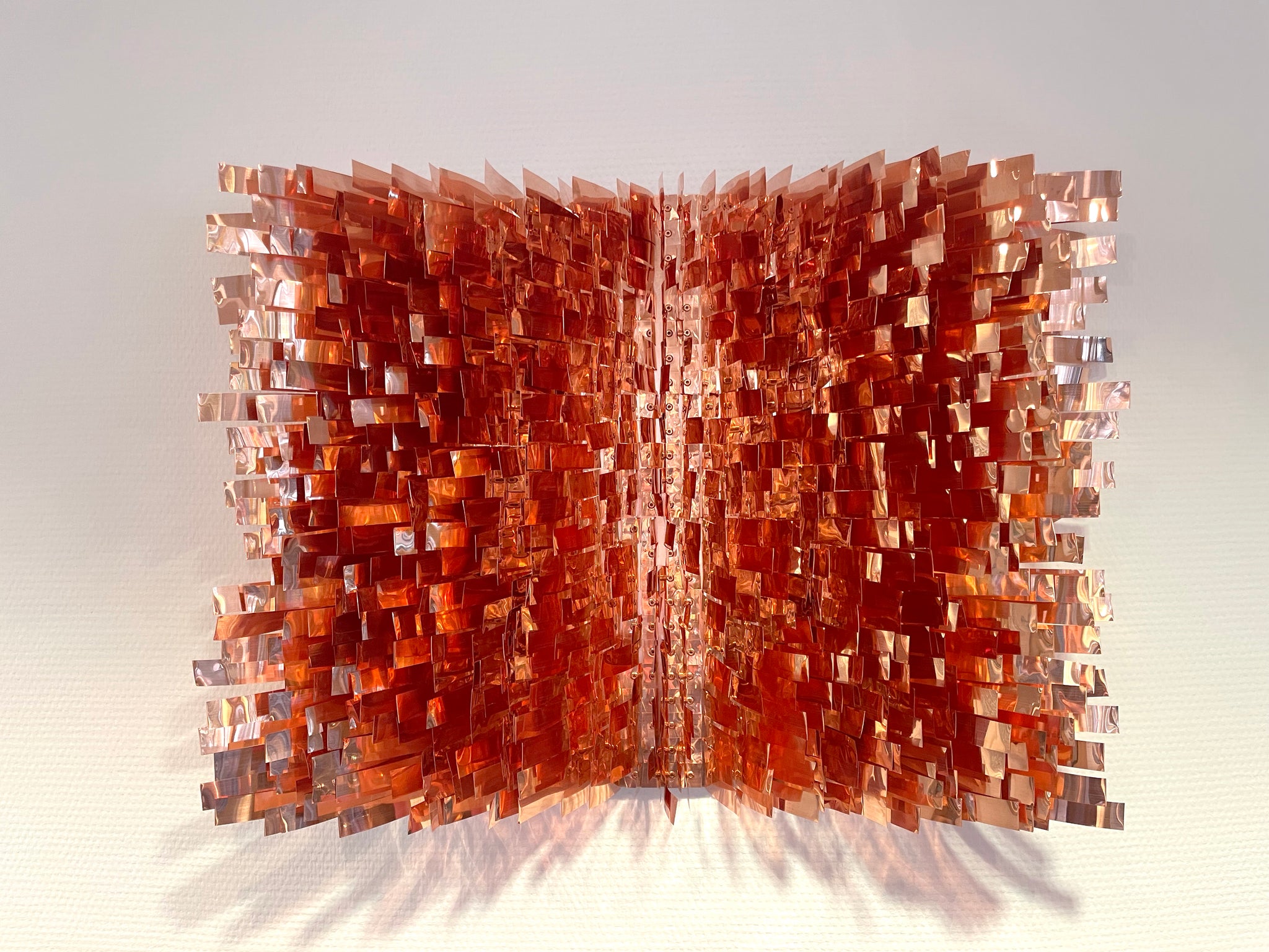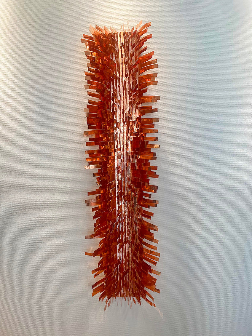Hochglanz polierte Kupferbänder auf massiver Kupferplatte montiert, incl. umlaufender Aluminiumleiste zur Aufhängung.